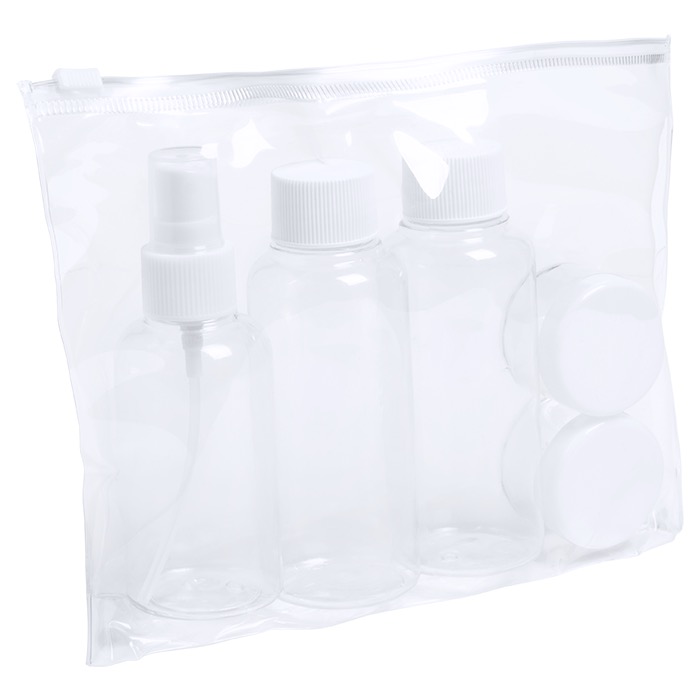 Includes two jars for gel and shampoo with screw-on cap, perfumer and two jars for cream